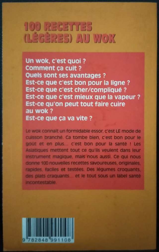 Un wok, c'est quoi ? Comment ça cuit ? Quels sont ses avantages ? Est-ce que c'est bon pour la ligne ? Est-ce que c'est cher/compliqué ? Est-ce que c'est mieux que la vapeur ? Est-ce qu'on peut tout faire cuire au wok ? Est-ce que ça va vite ? Le wok connaît un formidable essor, c'est LE mode de cuisson branché. Ca tombe bien, c'est bon pour le goût et en plus... C'est bon pour la santé ! Les asiatiques mettent tout ce qu'ils veulent dans leur instrument magique, mais nous aussi. Ce qui nous donne 100 nouvelles recettes savoureuses, originales, rapides, faciles et testées. Des légumes croquants, des plats craquants... et le tout sous un label santé incontestable.