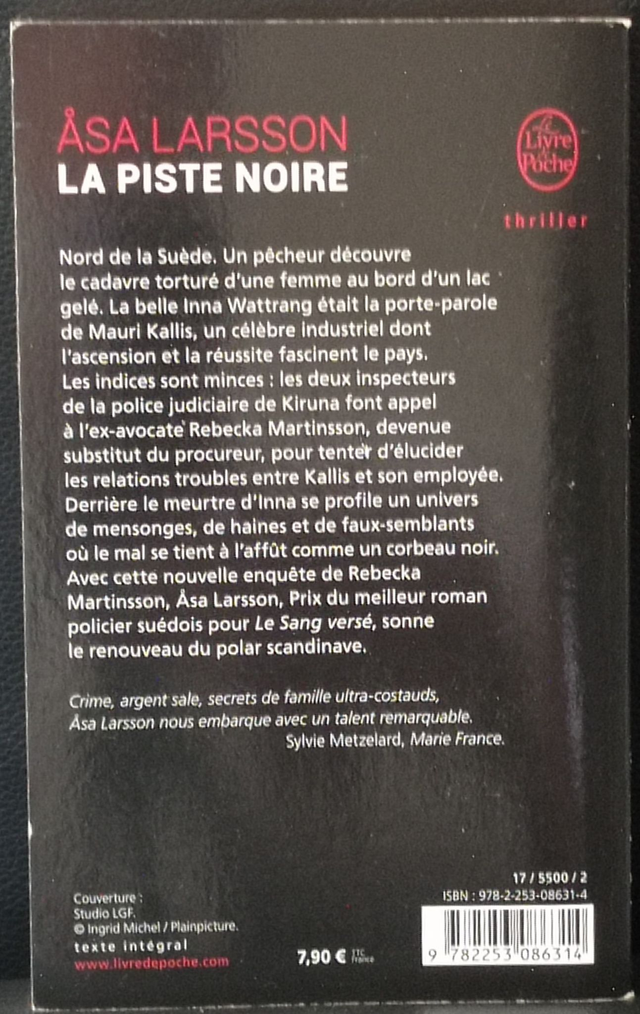 Nord de la Suède. Un pêcheur découvre le cadavre torturé d'une femme au bord d'un lac gelé. La belle Inna Wattrang était la porte-parole de Mauri Kallis, un célèbre industriel dont l'ascension et la réussite fascinent le pays. Les indices sont minces : les deux inspecteurs de la police judiciaire de Kiruna font appel à l'ex-avocate Rebecka Martinsson, devenue substitut du procureur, pour tenter d'élucider les relations troubles entre Kallis et son employée. Derrière le meurtre d'Inna se profile un univers de mensonges, de haines et de faux-semblants où le mal se tient à l'affût comme un corbeau noir. Avec cette nouvelle enquête de Rebecka Martisson, Asa Larsson, Prix du meilleur roman policier suédois pour Le Sang versé, sonne le renouveau du polar scandinave.