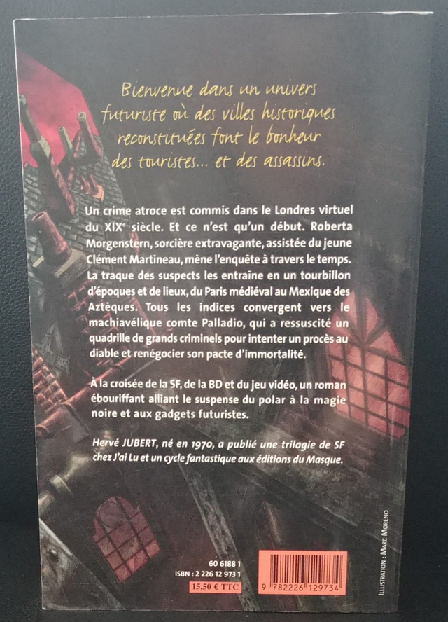 Un crime atroce est commis dans le Londres virtuel du XIXe siècle. Et ce n'est qu'un début. Roberta Morgenstern, sorcière extravagante, assistée du jeune Clément Martineau, mène l'enquête à travers le temps. La traque des suspects les entraîne en un tourbillon d'époques et de lieux, du Paris médiéval au Mexique des Aztèques. Tous les indices convergent vers le machiavélique comte Palladio, qui a ressuscité un quadrille de grands criminels pour intenter un procès au diable et renégocier son pacte d'immortalité.