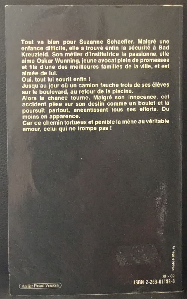 tout va bien Suzanne Schaeffer. Malgré une enfance difficile, elle a trouvé enfin la sécurité à Bad Kreuzfeld. Son métier d'institutrice la passionne, elle aime Oskar Wunning, jeune avocat plein de promesses et fils d'une des meilleures familles de la ville, et est aimée de lui. Oui, tout lui sourit enfin ! Jusqu'au jour jour où un camion fauche trois de ses élèves sur le boulevard, au retour de la piscine. Alors la chance tourne. Malgré son innocence, cet accident pèse sur son destin comme un boulet et la poursuit partout, anéantissant tous ses efforts. Du moins en apparence. Car ce chemin tortueux et pénible la mène au véritable amour, celui qui ne trompe pas !