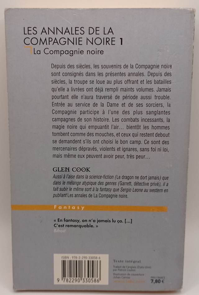 Depuis des siècles, les traditions et souvenirs de la compagnie noire sont consignés dans les présentes annales. Depuis des siècles, la troupe se loue au plus offrant et les batailles qu'elle a livrées on déjà rempli maints volumes. Jamais pourtant elle n'aura traversé de période aussi trouble. Entrée au service de la dame et de ses sorciers maléfiques, la compagnie participe à l'une des plus sanglantes campagnes de son histoire. Les combats incessants, la magie noire qui empuantit l'air, bientôt les hommes tombent comme des mouches, et ceux qui restent debout commencent à se demander s'ils ont choisi le bon camp. Ce sont des mercenaires, ils sont dépravés, violents et ignares, sans foi ni loi, mais même eux peuvent avoir peur, très peur...