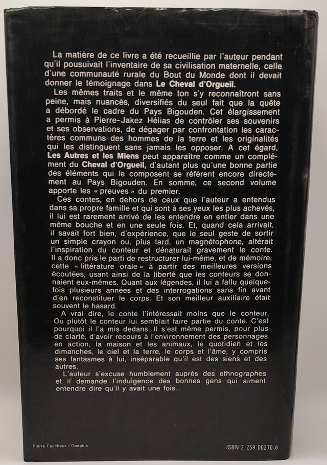 Les mêmes traits et le même ton s'y reconnaîtront sans peine, mais nuancés, diversifiés du seul fait que la quête a débordé le cadre du Pays Bigouden. A cet égard, les Autres et les Miens peut apparaître comme un complément du Cheval d'orgueil. Ce second volume apportant les .« preuves » du premier.