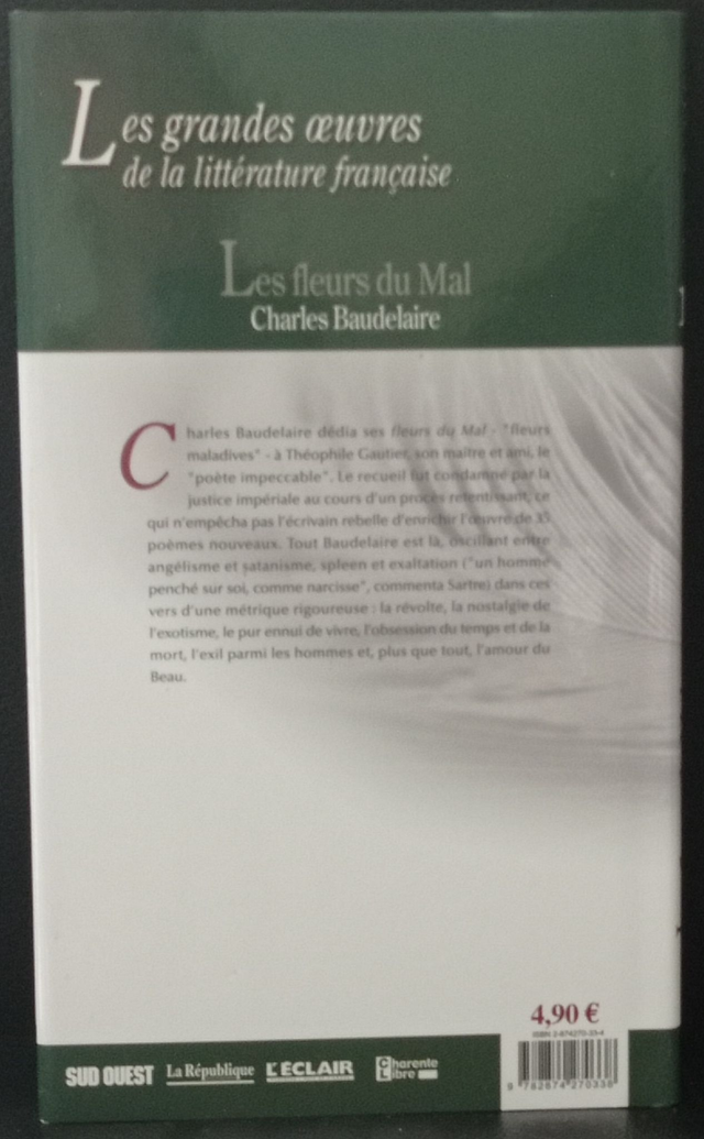 Charles Baudelaire dédia ses Fleurs du Mal - "fleurs maladives" - à Théophile Gautier, son maître et ami, le "poète impeccable". Le recueil fut condamné par la justice impériale au cours d'un procès retentissant, ce qui n'empêcha pas l'écrivain rebelle d'enrichir l'oeuvre de 35 poèmes nouveaux. Tout Baudelaire est là, oscillant entre angélisme et satanisme, spleen et exaltation ("un homme penché sur soi, comme narcisse", commenta Sartre) dans ces vers d'une métrique rigoureuse : la révolte, la nostalgie de l'exotisme, le pur ennui de vivre, l'obsession du temps et de la mort, l'exil parmi les hommes et, plus que tout, l'amour du Beau.