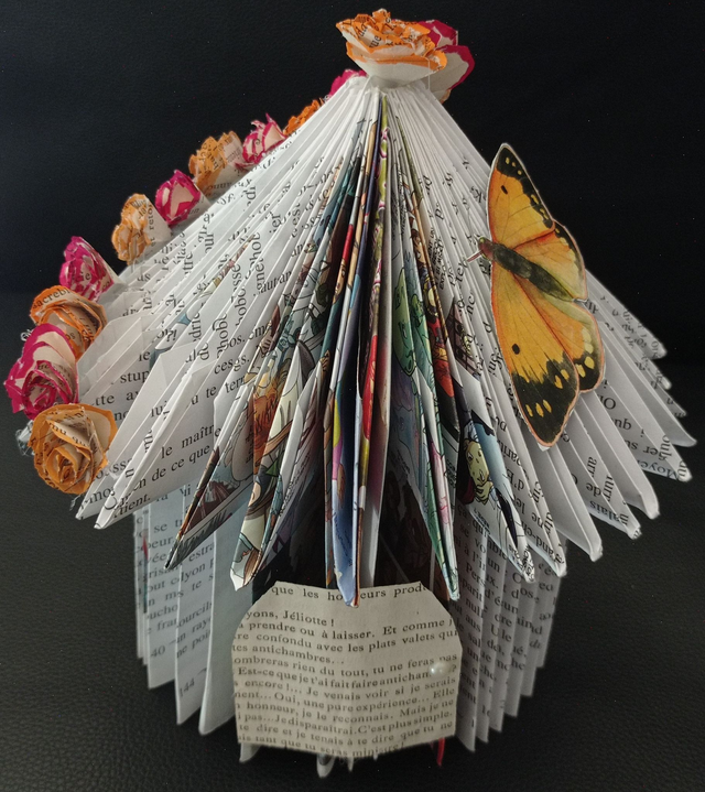 maison fait en pliage de livre avec des fleurs orange et jaune et papillon