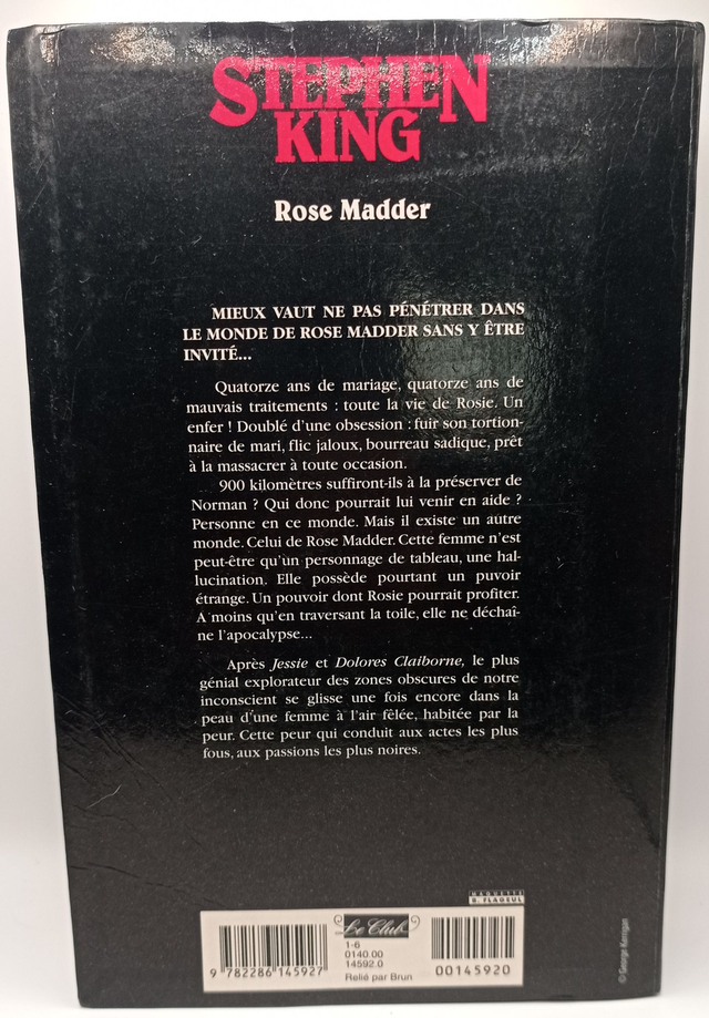 Quatorze ans de mariage, quatorze ans de mauvais traitements : toute la vie de Rosie. Un enfer ! Doublé d'une obsession : fuir son tortionnaire de mari, flic jaloux, bourreau sadique, prêt à la massacrer à la première occasion. 900 kilomètres suffiront-ils à la préserver de Norman ? Qui donc pourrait lui venir en aide ? Personne en ce monde. Mais il existe un autre monde. Celui de Rose Madder. Cette femme n'est peut-être qu'un personnage de tableau, une hallucination. Elle possède pourtant un pouvoir étrange. Un pouvoir dont Rosie pourrait profiter. À moins qu'en traversant la toile, elle ne déchaîne l'apocalypse...