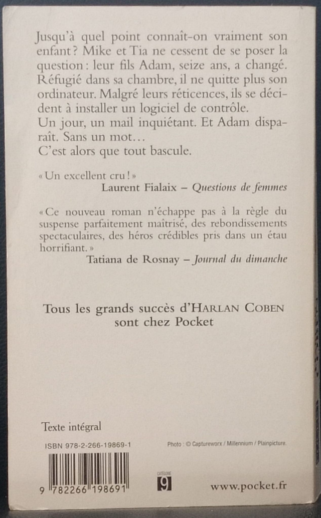 Jusqu'à quel point connaît-on vraiment son enfant ? Mike et Tia ne cessent de se poser la question : leur fils Adam, seize ans, a changé. Réfugié dans sa chambre, il ne quitte plus son ordinateur. Malgré leurs réticences, Mike et Tia se décident à installer un logiciel de contrôle. Un jour, un e-mail inquiétant. Et Adam disparaît. Sans un mot… C'est alors que tout bascule.