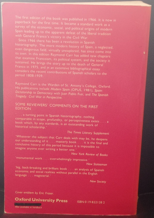The first edition of this book was published in 1966. It became a standard work as a survey of the economic, social, and political origins of modern Spain leading up to the apparent defeat of the liberal tradition with General Franco's victory in the Civil War. In this edition, Carr added new chapters that examine Francoism, its political system, and the society it sustained.