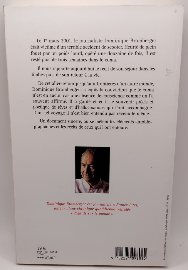 Le 1er mars 2001, le journaliste Dominique Bromberger était victime d'un terrible accident de scooter. Heurté de plein fouet par un poids lourd, opéré une douzaine de fois, il est resté plus de trois semaines dans le coma. Il nous rapporte aujourd'hui le récit de son séjour dans les limbes puis de son retour à la vie. De cet aller-retour jusqu'aux frontières d'un autre monde, Dominique Bromberger a acquis la conviction que le coma n'est en aucun cas une absence de conscience comme on l'a souvent affirmé. Il a gardé et écrit le souvenir précis et poétique de rêves et d'hallucinations qui l'ont accompagné. D'un tel voyage il n'est bien entendu pas revenu le même. Un document sincère, où se mêlent les éléments autobiographiques et les récits de ceux qui l'ont entouré.