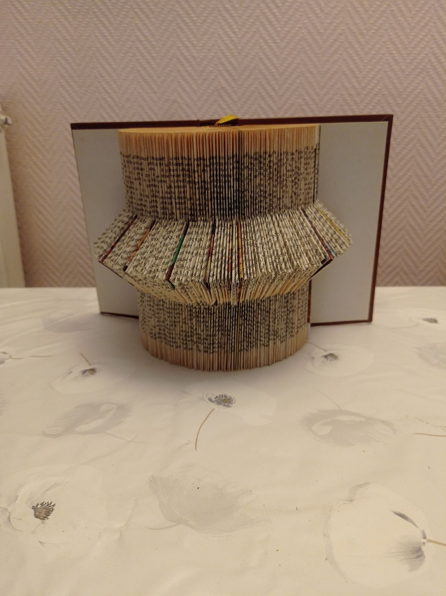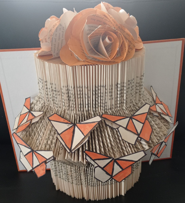 vase fait à partir d'un livre avec fleurs orange ainsi que papillon