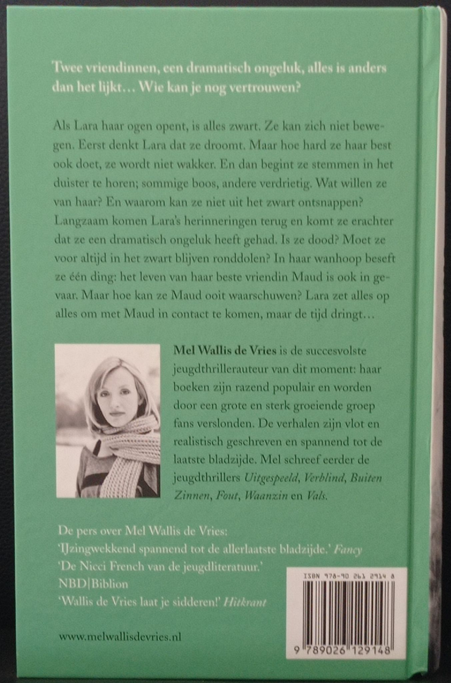 Twee vriendinnen, een dramatisch ongeluk, niets is wat het lijkt. Wie kan je nog vertrouwen? Als Lara haar ogen opent, is alles zwart. Ze kan zich niet bewegen. Eerst denkt ze dat ze droomt. Maar hoe hard ze haar best ook doet, ze wordt niet wakker. En dan begint ze stemmen in het duister te horen. Sommige stemmen zijn boos, andere verdrietig. Lara is bang voor de stemmen die onophoudelijk hoorbaar zijn. Wat willen ze van haar? En waarom kan ze niet uit het zwart ontsnappen? Dan komt Lara erachter dat ze een dramatisch ongeluk heeft gehad, en slaat de paniek toe. Is ze dood? Moet ze voor altijd in het duister blijven ronddolen? In haar wanhoop beseft ze één ding: het leven van haar beste vriendin Maud is ook in gevaar. Maar hoe kan ze Maud waarschuwen? En is het misschien al te laat? Lara zet alles op alles om met Maud in contact te komen, maar de grenzen tussen waarheid, bedrog en echte vriendschap zijn akelig dun.